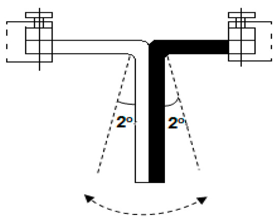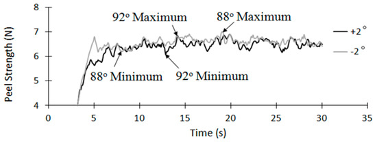 Noise factor is an uncontrolled factor during normal production or use but is controlled during the experiment. There are three types of noise: outer noise, which is caused by environmental conditions; inner noise, which is caused by the deterioration of elements or materials in the product; and between-product noise, which is caused by piece-to-piece variations between products. Noise factors are likely to produce variability in the response. For noise factor, historical data have proven that the peel angle would vary during exchanging the peel angle setting and during peeling process [2,28,29]. Peel angle deviation will affect the peel strength; thus, peel angle is considered as a source of variability. Two noise factors are considered in this study: peel angle deviation ±2° and tensile weight w. Peel angle is adjusted to three levels: 60°, 90°, and 120°. Peel angle ±2° is a noise factor because it is possible to have an inaccurate reading if the peel angle is changed by the angle adjuster by two degrees due to natural movement, as shown in Figure 6. The noise in peel angle is defined as deviation ± 2° for each level. Noise 1 is the higher level (N1 = +2° and maximum peel strength value) and Noise 2 is the lower level (N2 = −2° and minimum peel strength value). The plot for noise factor is shown in Figure 7. After completing the noise strategy, the selection of a control factor is done. The objective of this T-peel test is to satisfy the industry requirement of getting the minimum variation for flexible film.