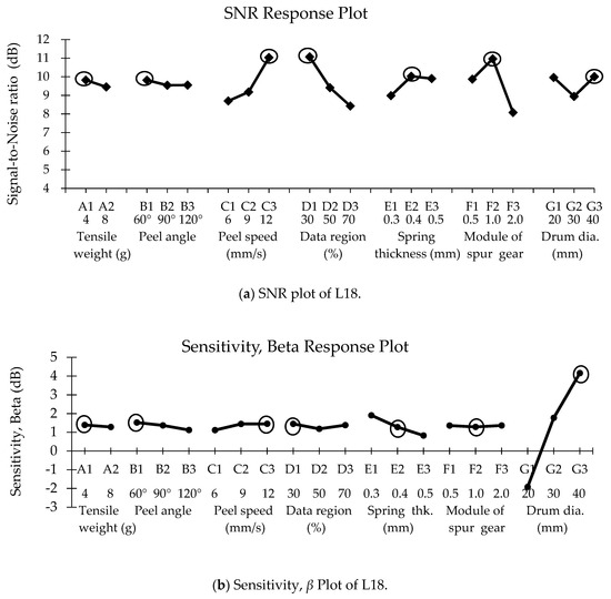 The control factor from testing condition includes tensile weight that is used to keep the specimen in T-shape, peel angle, peel speed, and peeling curve region. From the design of apparatus condition, the control factors are parallel spring thickness, module of spur gears, and drum diameter. The factor’s level is decided based on the experiments’ objective. The levels must not be so close to each other that the effect on the response is not observable or undetected. Levels must also not be very far apart that there is a region of unknown process behavior. Previous process knowledge is useful to determine the level. For example, three levels are chosen to observe the curvature effect on the response. Based on Figure 3, control factors B, C, D, E, F, and G are analyzed with three levels. Two levels are chosen to determine whether the factor has an effect on the response. Control factor A tensile weight is analyzed with two levels 4 g and 8 g. More than three levels are suitable to observe significant trend or behavior, such as sudden rise or drop at certain levels. The experimental design space is large, and it needs a strategy to explore. After determining the control factors and factor’s level, they are assigned into an orthogonal array. An orthogonal array is used for optimization to maximize the signal-to-noise ratio [1,8,9]. Balance set of experimentation runs is provided by orthogonal array. Design of experiments using orthogonal array L18 is utilized with one two-level factor (tensile weight) and six three-level factors (peel angle, peel speed, data region, spring thickness, module of spur gear, and drum diameter) as shown in Table 1.