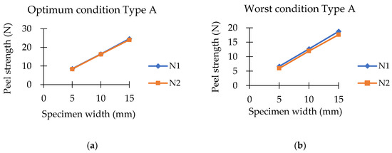 In P-diagram, robustness is optimized by evaluating the control factors and their levels. The noise factor condition is varied accordingly to minimize variation that influences the response. Signal-to-noise ratio (SNR) with dynamic response (Equation (1) is used in this study due to the signal factor existence. A dynamic signal-to-noise ratio (SNR) has been used in this study where the specimen widths of 5 mm, 10 mm, and 15 mm as the signal factor levels are used to measure the peel strength linearity.