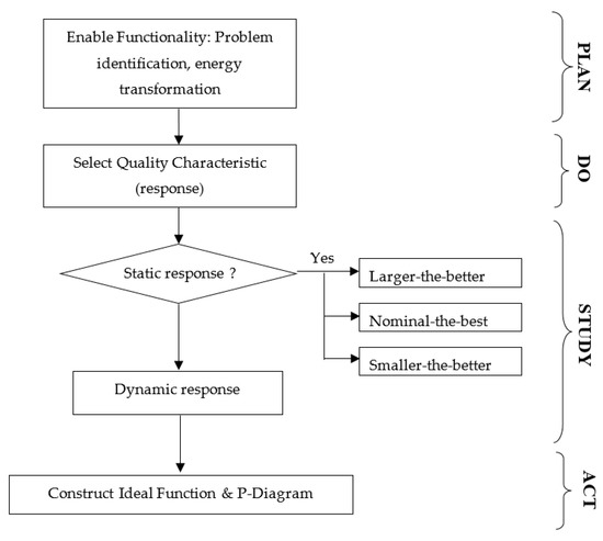 This stage consists of enabling the function, energy transformation, quality characteristic selection, and finally forming the ideal function. In order to enable the functionality of the system, a careful analysis of the ideal function that transforms the energy into quality characteristic is done. This is done in “Plan” stage to define the function of the system that is being investigated. The response, Y, or also called quality characteristic represents the energy transformation of the system, then the interactions are greatly reduced because energy is additive. In order to improve quality, it is important not to measure and analyze the response, but to measure the function, that is energy-related because energy has additivity.