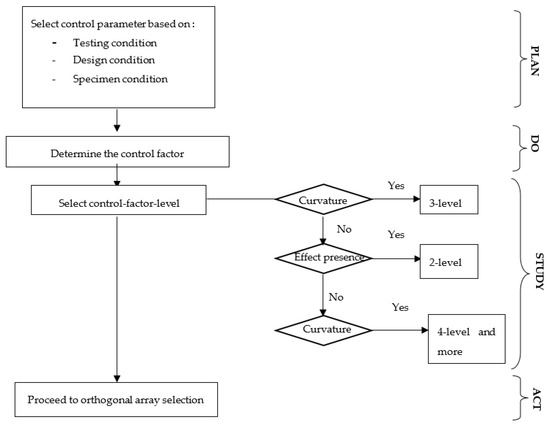 Selecting the control parameters is started with response’s objective, sometimes called its quality characteristic. Similarly, in selecting the noise parameter, engineering knowledge of the process can be used to select and judge the control parameters and their level apart from historical data, previous experimental results, theoretical knowledge, expert opinions, observational data, and other relevant data. After identifying the noise factor, control factor evaluation is done. Noise measurement system is done before the control factor system to ensure the effect of all the noise parameters can be minimized by the best control-factor-level combination. The final control factors for the T-peel test are tensile weight, peel angle, peel speed, spring thickness, data region, diameter of drum, and module of spur gear. Peel length is fixed at 60 mm in x-axis direction. Control-factor-level is then studied to prevent any misleading results due to incorrect control-factor-level. Final control factor and level is selected in “Act” stage thus activating the “Plan” stage in the next sub-system. Figure 14 summarizes the methodology flow of control measurement system (C):