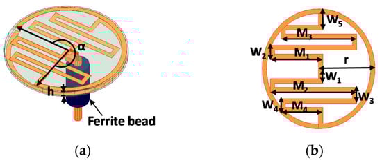 An electrically small planar antenna having a quasi-isotropic radiation pattern was designed as shown in Figure 1a,b. The design parameters are also listed. The antenna is composed of a small meander dipole and arcs extended from each end of the dipole as in [18]. The arc at the top of the substrate rotates in a counterclockwise direction, while the arc at the bottom rotates in a clockwise direction, and they form a small loop together. Each meander arm is also placed at the top and bottom of the substrate, and the whole configuration is fed by a coaxial cable at the center. The signal line of the cable is connected at the arm on the top and the outer conductor is connected at the bottom. The material characteristic of a ferrite bead is characterized and implemented in a full-wave electromagnetic simulation to prevent current flowing over the outer layer of the feeding conductor. This helps to minimize the effect from the feed line such that the radiation pattern is not distorted. Ansys HFSS (High Frequency Structure Simulator) was used for the full-wave electromagnetic simulations.