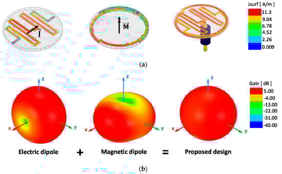 Rogers RT/duroid 5880™ with a thickness (h) of 0.72 mm (εr = 3 and tanδ = 0.0009) was used for the substrate. Since the radius of the substrate r was 0.07 λg at 2.45 GHz, the electrical length of the meander line and arc was also short. Therefore, the current distributions on each configuration of the meander part and arcs were nearly constant, as shown in Figure 2a, and are referred to as perpendicularly placed electrically small electric dipole () and magnetic dipole (), having TM and TE mode radiation patterns, respectively. Consequently, their summed pattern was nearly isotropic, as shown by the simulated 3D radiation pattern in Figure 2b. The radiation pattern of the proposed antenna differs from the unidirectional radiation pattern of a Huygens source antenna that is also composed of the crossed electric and magnetic dipoles [29,30,31]. The main idea relies on the phase difference between the two dipole sources. When the phase difference is 180°, a unidirectional radiation pattern can be created since the fields are constructively added at one direction whereas they are canceled at the opposite side (see Figure 1 of [29]). According to the theory, the total radiated electric fields from the two dipoles are summed to have the isotropic radiation pattern when the phase difference is 90° [14]. For this reason, the circular polarization is created at certain points of the radiation space. This will be discussed more with the axial ratio plot of the proposed antenna (See Figure 6).