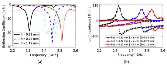 Parameter study results on h: (a) Reflection coefficient. (b) Input impedance.