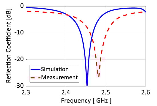 Simulation and measurement results of the reflection coefficients of the proposed antenna.
