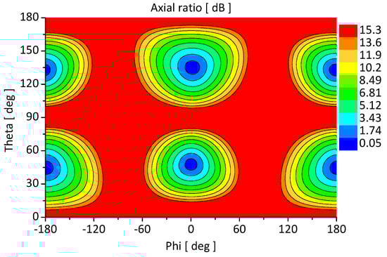 Lastly, the axial ratio (AR) of the antenna at the resonant frequency was calculated in a spherical space and is plotted in Figure 6 to show the spatial polarization dependency. We found that a circular polarization with AR < 3 dB was created at certain points but overall linear polarization was formed. This can be explained by the antenna configuration with the electric dipole and magnetic dipole being along the x-axis and the z-axis, respectively. The antenna was linearly polarized when the field components of the two dipoles were in the same magnitude and phase in the xy-plane (i.e., θ = 90°) and the yz-plane (i.e., φ = 90°). This showed a circular polarization at the points in the xz-plane, such as when θ is 45° and 135° and φ is 0° and 180°. These occurred where the electric field components of the electric dipole Eθ and magnetic dipole Eφ met with same magnitude and 90° phase shift. This showed that the proposed antenna can generate the quasi-isotropic radiation pattern from the sum of two different polarizations from the two different dipole configurations. This also can be verified from the pattern measurement (See Figure 9c). Thus, the proposed antenna shows a quasi-isotropic radiation pattern not only in terms of its magnitude but also in terms of polarization.