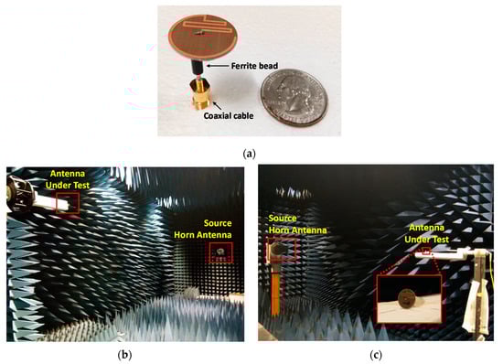 The proposed antenna was fabricated by etching both sides of the same Rogers substrate used in the simulation and shown in Figure 7a. A U.S. quarter was placed for size comparison. The impedance resonance characteristic was measured using an Anritsu MS46522B vector network analyzer. As shown by the dashed line in Figure 4, it resonated at 2.47 GHz, showing very good agreement with the computed expectation with only negligible deviation. The gain, radiation efficiency, and patterns were measured in an anechoic chamber. The two-dimensional electric field radiation pattern measurement was carried out in the far-field measurement chamber as shown in Figure 7b. It had dimensions of 14 7 6.7 m and was available for the frequency range from 200 MHz to 20 GHz with an E5071C ENA series network analyzer (Agilent Technologies). The three-dimensional gain and efficiency measurements were carried out in the mobile antenna measurement chamber shown in Figure 7c. Its dimensions were 8 4 4 m and it covered the frequency range from 200 MHz to 6 GHz with an E8362B PNA network analyzer from Agilent Technologies. The proposed antenna was used as a receiver and the standard horn antenna was used as a source antenna. The radiation pattern of each plane was measured for both horizontal and vertical polarization by rotating the orientation of the source antenna. The simulated and measured peak gains and efficiencies are plotted in Figure 8. The figure shows that the measured maximum peak gain and efficiency are 0.8 dBi and 79.2%, respectively, which shows similar performance to the simulation results.