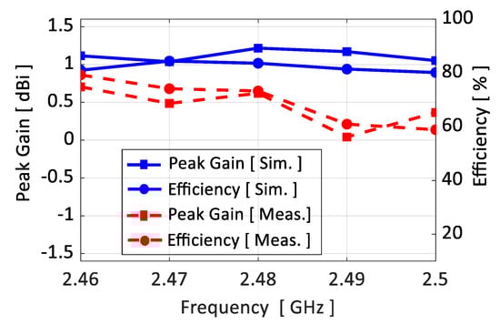 Simulation and measurement results of the peak gain and radiation efficiency.