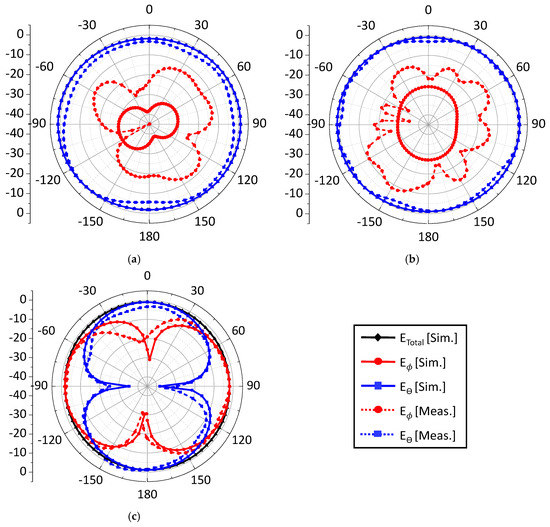 Simulation and measurement radiation pattern of the proposed antenna: (a) xy, (b) yz, and (c) xz planes.