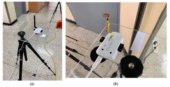 Antennas for the performance evaluation setup: (a) Zolertia board with default omni-directional antenna and (b) Zolertia board with quasi-isotropic antenna.