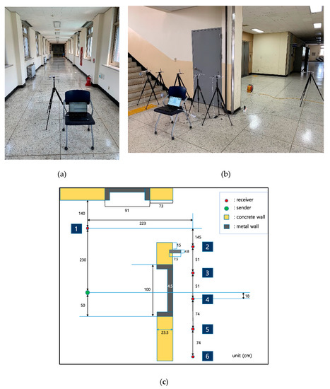 Measurement setup. (a) Photo for the LOS environment. (b) Photo for the NLOS environment. (c) Floor map for the NLOS environment.