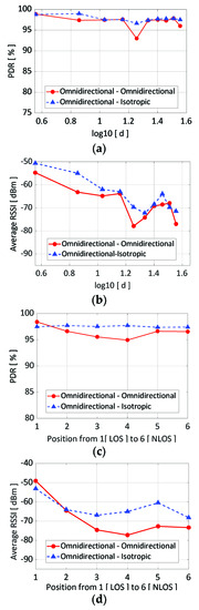 Measured PDR and RSSI. (a) PDR under LOS, (b) RSSI under LOS, (c) PDR under NLOS, and (d) RSSI under NLOS.