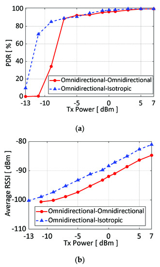 We also evaluated the link reliability when the transmitter and the receiver were deployed at the different floors of the building. The transmitter was at the lower level of the floor. The vertical distance between the two nodes was around 3.7 m. Figure 14 shows the average PDR and RSSI measurement as a function of various transmit powers between −13 and 7 dBm. A significant improvement was observed when the developed quasi-isotropic antenna was used. One interesting observation is that the proposed antenna provides around 3 dB gain of average RSSI with respect to those using the omni-directional antenna pair when the transmit power is greater than −9 dBm. It also provides PDR greater than 70 for transmit power between −11 and −9 dBm while the omni-directional antenna pair has low PDR of less than 35%.