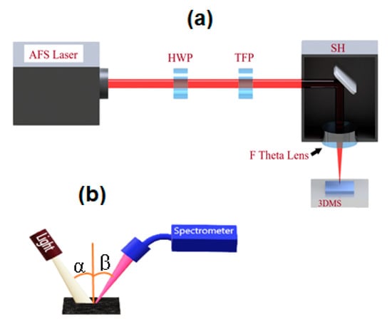 (a) Experimental setup for metal surfaces treatment using a femtosecond laser at power 4.5 W, pulse duration 40 fs, central wavelength 1030 nm, and repetition rate 150 kHz coupled with a scan head (SH) containing an F-Theta objective lens. The sample was placed on a 3D motion stage (3DMS). A half wave plate (HWP) and a thin film polarizer (TFP) were used to control the average power of laser pulses. (b) Experimental set up for the measurements of the angle-dependent color reflectance from the processed surfaces. Light (tungsten bulb) was shone on the processed samples at an angle α = 20° with regard to the axis perpendicular to the sample; and the diffracted light was measured with a fiber spectrometer at variable angle (β).