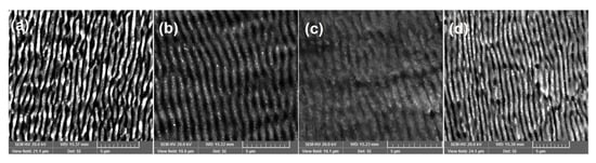 Scanning electron microscope (SEM) images of the processed (a) stainless steel, (b) copper, (c) aluminum, and (d) brass surfaces. The scanning speeds for stainless steel, copper, aluminum, and brass were 350, 400, 500, and 450 mm/s respectively. The laser beam direction is perpendicular to the Laser Induced Periodic Surface Structures (LIPSS) orientation. The scale bar for all images is 5 µm.