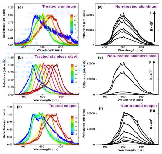 Reflectance spectra from the treated surfaces [(a) aluminum, (b) stainless steel, (c) copper] and non-treated surfaces [(d) aluminum, (e) stainless steel, (f) copper]. Different curves on each graph correspond to different angles of observation. One can see that, in the case of non-treated surfaces, the reflectance spectra remain the same at different angles of observation, contrary to the case of treated surfaces. The colors in (a–c) correspond to the colors viewable by eye at the corresponding angles. The angle (β) ranged from 0° to 40°, where 0° corresponds to the position of the spectrometer when it is perpendicular to the sample. As β increased, longer wavelengths were detected.