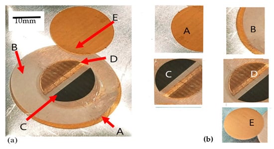 Demonstration of erasing the color from the treated sample and formation of new colors produced on the erased surface of aluminum. Panel (a): original sample; panel (b): explanation of panel (a): A, initially created dark golden disk. B, whitish color after erasing dark golden color, C, black semi-circle after erasing whitish color, D, light golden strip after erasing whitish color, and E, dark golden color painted on the whitish color. The scanning speeds for dark golden, white, black, and light golden were 70 mm/s, 1500 mm/s, 10 mm/s, 200 mm/s (two runs) respectively. The fluence of the laser beam was in the range 0.5–1.0 J/cm2. Figure 5b represents the images of A, B, C, D and E parts repectivly.