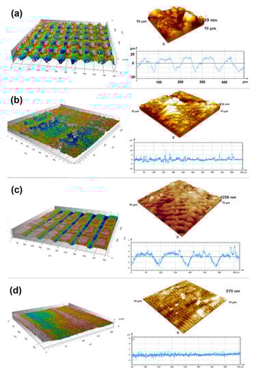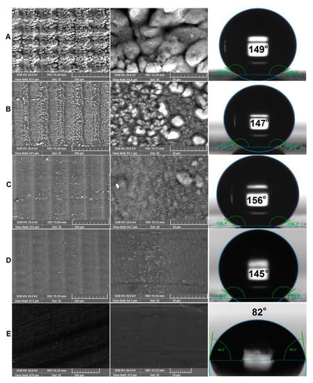 Laser ablation can be considered one of the most efficient techniques to directly produce superhydrophobic surfaces on a wide range of materials []. By optimizing the laser processing parameters, it is possible to produce robust 3D structures that are necessary to prolong the durability of the processed surfaces []. Femtosecond lasers have been used dominantly to produce nanostructures on different metal surfaces to alter their wettability behavior. Following laser ablation, processed surfaces may initially behave as superhydrophilic, but when kept in ambient air for many days, they transform into super-hydrophobic ones with very small contact angle hysteresis that makes them suitable for a wide range of technological and bio-medical applications []. Some divergences of aging-dependent contact angle hysteresis were observed for surfaces processed by femtosecond pulses compared to those processed by nanosecond pulses [,]. Superhydrophobicity of laser-ablated surfaces is attributed to the surface chemistry and topography of the processed surface [,]. The ultimate degree of the achieved superhydrophobicity depends on the produced surface roughness. Furthermore, the changes in the wettability behavior of the air-exposed laser-processed surfaces can be also attributed to the increase of carbon content and decrease of surface polarity due to chemisorbed organic substances from the air moisture [].