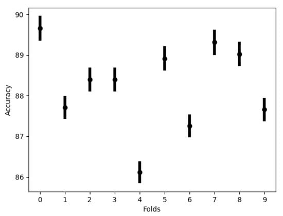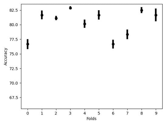Figure 3 and Figure 4 show the 10-folds cross-validation results for the trained CNN and SNN models, respectively. In addition, they show the mean accuracy and the standard deviation for each fold. We can observe a reasonable symmetric distribution and that the mean captures the central tendency well. The cross-validation results belong to the pre-trained model which has been applied to calculate the results in Table 8.