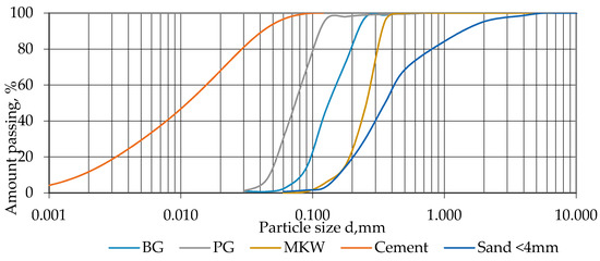 The other components of the binder were metakaolin as supplementary cementitious material and Portland cement CEM I 42.5N (CEM). Chemical composition of CEM is given in Table 1. The initial setting time was 182 min and the final setting was 224 min (according to LVS EN 196-3); the normal consistency was 28.2% (according to LVS EN 196-3). Blaine fineness of cement was 3787 cm2/g (according to LVS EN 196-6). Na equivalent was 1.68. Compressive strength after 1 day was 15.4 MPa, after 2 days—32.9 MPa, after 7 days—48.8 MPa, and after 28 days—60.5 MPa. Waste metakaolin (MKW) was obtained from the porous glass granule production factory “Stikloporas” JSC (Druskininkai, Lithuania). Metakaolin is a by-product from the final stage of expanded glass granule production, where kaolinite clay powder is used as a substance for anti-agglomeration and is heated at 850 °C temperature for 40–50 min. MKW is mostly amorphous dehydration product of kaolinite, Al2(OH)4Si2O5, which exhibits strong pozzolanic activity often used in the concrete industry as a supplementary cementitious material. XRD pattern and detailed description of MKW was published before [17]. MKW contains amorphous metakaolin detected in 2θ region from 15 to 30°, and some minor crystalline phases were also detected in MKW: quartz (SiO2) and Halloysite Al2Si2O5(OH)4. The specific surface area of the MKW is 15.86 m²/g. Loss of ignition for metakaolin was 11.5%. The particle size distribution of materials used in the preparation of ternary binder is given in Figure 1.