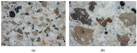 The macrostructure of GCP-PG mortar is given in Figure 2. The difference between binder depending on the gypsum type used (PG or BG) did not influence the appearance of the macrostructure of the material. Mortar has a homogenous structure where individual sand filler grains and the binder can be identified. As 50 wt.% of the binder is gypsum, the material has a white appearance that is characteristic for gypsum binders. The whitish appearance could be an advantage for the creation of exposed architectural or structural elements. Small black inclusions as remains of foam glass granules originated from waste metakaolin were indicated, which could be a negative factor influencing the strength of the binder and mortar.