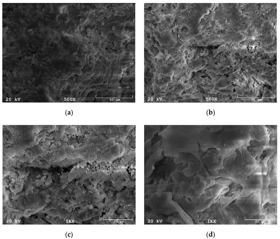 Microstructure of the ternary binder detected by SEM in magnification of 500x and 1000x. (a,c) GCP-phosphogypsum (PG), (b,d) GCP-BG.