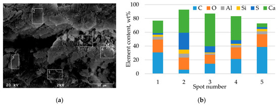 The EDX analysis of the GCP-PG binder is given in Figure 5. Large amount of Ca element was identified in most EDX points analyzed, which is associated with the fact that Ca is present in all binder components (phosphogypsum, cement, and metakaolin). The gypsum source in the structure can be identified through element S, which comes from PG binder (CaSO4 0.5H2O). Small quantities of Al and Si were identified as elements coming from metakaolin and cement. This explains the fact that no cement minerals were identified by XRD. The XRD analysis of raw material mixture and hardened binder was investigated while no strong new mineralogical peaks were identified. Mostly transition between gypsum hemihydrate and gypsum dihydrate was observed.