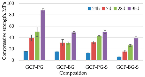 The compressive strength results are given in Figure 6. The compressive strength increased during the water curing similar as for Portland cement binder. The strength after demolding at 24 h was similar among all samples (13–15 MPa). The further curing resulted in slower strength gain for mortars (GCP-PG-S and GCP-BG-S). At the age of 28 d, the strength of moist samples reached 50 MPa for GCP-PG and 30 MPa for GCP-BG. The strength increase was not observed between 7 and 28 d for GCP-BG. The mortar strength reached 26 MPa for GCP-BG-S and 43 MPa for GCP-PG-S. After sample drying, material strength increased significantly at the age of 35 d. The GCP-PG reached 88 MPa while GCP-PG-S mortar reached 50 MPa. Binder GCP-BG had 49 MPa and mortar GCP-BG-S had 39 MPa, respectively. The failure of the mortar was mostly in the transition zone of aggregate and binder. Such result is highly competitive and promising compared to traditional Portland cement mortars. The higher strength results obtained for materials based on PG could be explained by the fine nature of PG giving more reactive nature for ternary binder. Moreover, commercial gypsum BG could contain other additives that could lead to lower strength results.