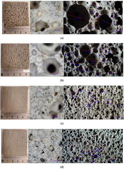 Macrostructure and microstructure of ternary system binder foams. (a) GCP-BG-1, (b) GCP-BG-2, (c) GCP-PG-1, (d) GCP-PG-2.