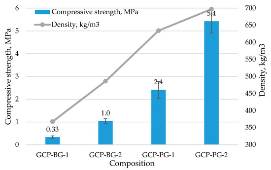 The compressive strength results of prepared ternary system binder foams are given in Figure 9. The compressive strength of GCP-BG-1 was 0.33 MPa and increased to 1.0 for GCP-BG-2. The increase of compressive strength was observed for GCP-PG. For GCP-PG-1, it was 2.4 MPa and increased to 5.4 MPa for GCP-PG-2. The strength increase is associated with the increase of foam bulk density and with the size of macropores formed during production. For samples made with PG, pores were smaller. Foam samples after water absorption tests were tested for compression to determine softening coefficient of the foams. Since gypsum is not watertight material and in proposed binder it is a major part of the binders’ component (50 wt.%), concerns regarding water tightness were analyzed (Table 6). It was detected that water softening coefficient was from 0.50–0.64. Similar trends were observed with concrete foams before—the compressive strength decreases with the increase of volumetric moisture content for every density ranging from 300–800 kg/m3, but the softening rate was lower—the compressive strength in the immersed saturation state is about 0.86–0.89 times of that in the standard curing state [21].