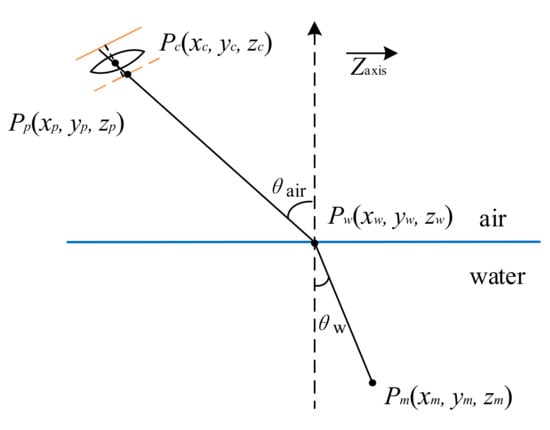 Where the is the position of the camera light spot, is the actual position of the marker point, and and are, respectively, the intersections of light and water and imaging plane.
