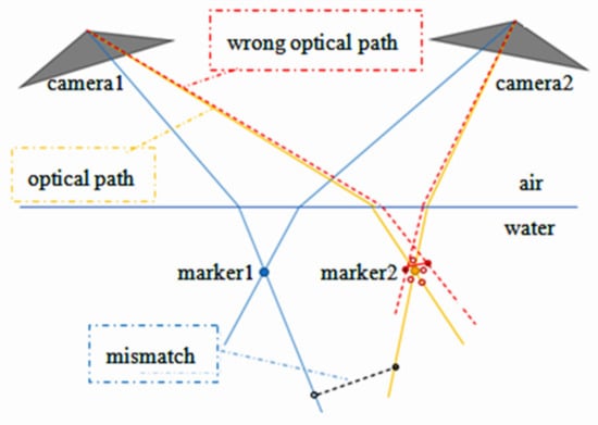 Take the case of two cameras, for example, because of the error, the two lights from same marker cannot be intersected in the water. As shown in Figure 2, the yellow line indicates the light in the ideal case and the red line indicates the light in actual measurement, hence the intersection point cannot be used to judge whether markers are matched. Despite the two lights being in different planes, their vertical distance is short, especially compared to the shortest distance of the optical path of unmatched markers. Hence, the shortest distance of the light can be used as the basis to filter the data. If the shortest distance of light is greater than the threshold, the markers must be unmatched. Because the general marker will be captured by more than two cameras, we can get many measurement points near the actual position of the marker. If there is more than a pair of measurement points in the vicinity, they must be matched.