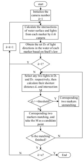 The markers matching process is shown in Figure 3. Assume that the intrinsic parameters and pose of each camera and 2D coordinates of each marker on the image are known. The flow chart demonstrates how the markers, originally in 2D coordinates, become the candidate points through the coordinate system conversion and data screening.