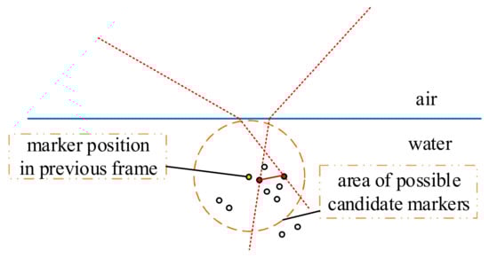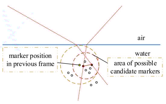 In general, the swim speed of the freshwater fish is within 120 cm/s, and the frame rate of the GoPro camera that we used in the experiment is 120 fps, which results in the moving range of the marker between adjacent frames being within 10 mm. Therefore, it can be regarded that the marker in the current frame is confined in a spherical area, the center of which is the marker in the previous frame, with a radius of 10 mm, as shown in Figure 4.