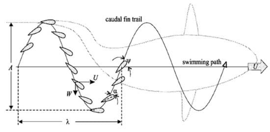According to Videler’s experiment [23], the propulsion movement consists of two parts: the body’s fluctuation and the caudal fin translational swing. The movement of caudal fin is shown in Figure 7 [24].