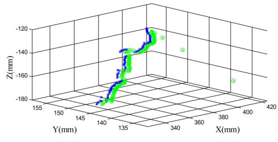 Figure 9 shows the spatial position and the position after Kalman filtering of a marker in the live fish experiment, where the blue one indicates the measurement position and green one indicates the position processed with adaptive Kalman filtering.