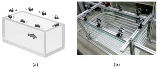 In order to capture the movement information of fish and meet the image clarity, a fish tank with size of 1 m by 0.5 m by 0.5 m, with a surrounding LED strip, is used and eight numbered cameras of GoPro Hero4 with an image resolution of 1980 by 1080 and frame rate of 120 fps are fixed on an aluminum alloy bracket in the peripheral area, three of which are arranged on the long side and one is arranged on the short side. The overall experimental platform is shown in Figure 10. It should be noted that the distribution of eight cameras are centrosymmetrical to enable shooting with a wider range.