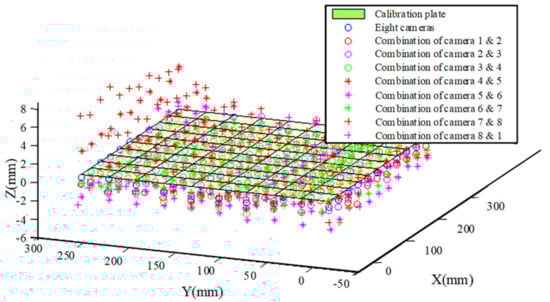For the underwater error analysis, we fixed the calibration plate at the bottom of the fish tank and shot it from the air by the fixed camera, which set the world coordinate system with the plane of the calibration plate as Z = 0. Then we poured the water into tank, measured the water depth, and shot again. After that, the calibration plate corner can be reconstructed based on the underwater 3D reconstruction theory mentioned above. Figure 11 shows the result of underwater 3D reconstruction with water depth of 206 mm. The green plane in the figure represents the plane of the calibration plate and the positions of the intersection points are the actual positions of the calibration plate corners. It can be seen that combinations with a large error of underwater 3D reconstruction includes camera 4 and 8.