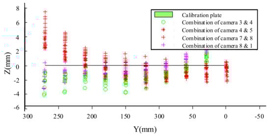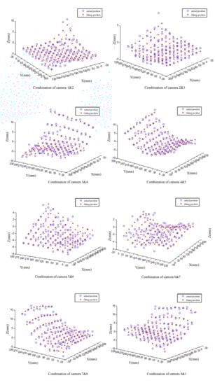 Figure 12 shows the positions of the reconstruction points of above partial combinations in the Y-Z plane, the reconstruction points are tilted at both ends of the Y axis, and cameras 5 and 7 are arranged in the positive direction of the Y axis, while cameras 1 and 3 are arranged in the negative direction of Y-axis, that is, the location where tilt is close to the camera.