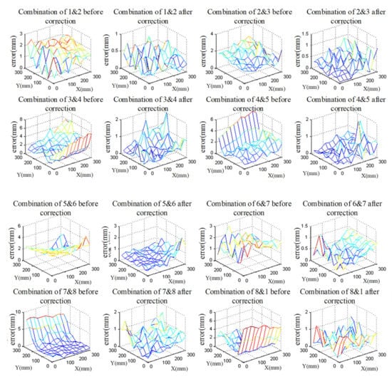 It can be concluded that before calibration, the maximum error is 8.45 mm and the average error is 2.06 mm and after correction, the maximum and average error are, respectively, 2.37 mm and 0.53 mm. The error distributions are shown in the Figure 16 and It is obvious that the error is significantly reduced after correction.