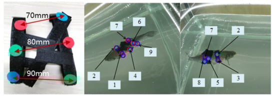 In this experiment, a carp about 0.5 kg that tied with 2 cm Velcro stuck with numbered markers is used as the experimental object. We numbered the markers attached to the fish and sorted it from the head to the tail. Figure 17 shows the pictures taken by camera 1 (left) and camera 5 (right) respectively, where marker 1 to 3 are located in the front part of the fish, 4 to 5 are located in the middle part of the fish, and 6 to 9 are located in the back part of the fish.