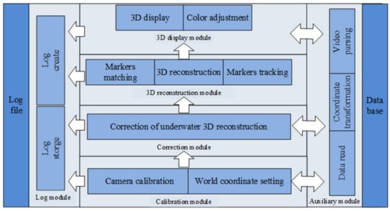 Based on the key technology of multi-media motion capture, we use Visual Studio, OpenCV, OpenGL, DataBase and other tools to design and develop its software system for achieving the camera calibration, motion capture, 3D display and other function. The system adopts modularization design and it is divided into six modules: log, auxiliary function, calibration, correction, 3D reconstruction and 3D display. The system structure and the software interface are shown in Figure 18 and Figure 19 respectively.