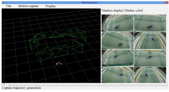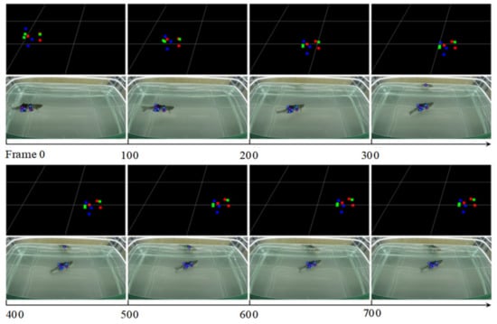 After setting the world coordinate system, it starts the 3D reconstruction experiment of live fish: capturing the video of fish with 8 cameras simultaneously and reconstructing the markers attached to the fish body based on the image information with homemade motion capture software. The reconstruction result is shown in Figure 20. It displays the spatial positions of markers after 3D reconstruction taken from 0 to 700 frames with 100 frames separated, and the corresponding frame numbers by camera 6 with appropriate angle, where all markers are covered, is chosen as the comparison.