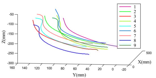 According to the previous experimental data, we can get the motion trail of fish, which is shown in Figure 21, it can be seen from the picture that the tracks of marker 1 to 3 are relatively stable, while the tracks of markers 4 to 9 swing with a certain degree, and this is consistent with the swimming model of the Carangidae that the propulsion force is mainly caused by tail swing.