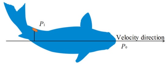 Because fish swimming is a dynamic process, we take the relative movement between markers on the fish tail and markers on the front part of fish as a study object and select the motion direction of markers 1 to 3 as the motion direction of the fish. Then, the relative motion direction of each marker can be obtained, that is adjusting the overall fish swimming to the swimming along the X axis and observing the position of marker relative to it. As shown in Figure 22, the position and velocity direction can be determined by the marker 1 to 3. The position of each marker in the relative speed direction is the shortest distance from the axis of to .