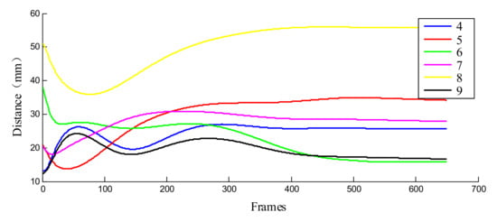 Figure 23 shows the distances between each marker and the axis, it can be seen that the markers of 5, 7, and 8 are similar in motion, all of which belong to the same side. Near the 50th frame, the motion direction of these three markers is opposite to that of the other four markers, which is because the axis is in the middle of the two markers sets; the markers on one side are away from the axis and the markers on other side must be close to the axis. At the same time we can see that when the fish is suspended in the water at 500th frame, the markers of 5, 7 and 8 are farthest from the axis, this because the markers of 1 to 3 are chosen as the basic markers, which leads to the result that the axis will be tilted to this side and the markers of the other side are farthest from the axis. Observing the data from 0 to 200 frames, it can be seen that the movement of the fish tail is similar to the sinusoidal motion, which also conforms to the tail swing of the carangid in Formula (21).