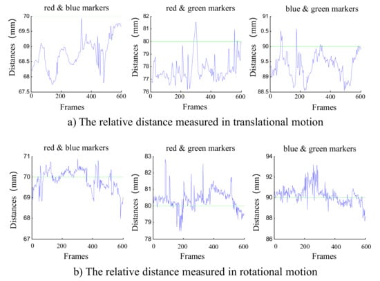 Because of the limitation of the experimental conditions, the system errors in our experiment are obtained by comparing the relative distances of calibrated markers which are arranged as in Figure 17. In order to achieve accurate results, both the motion of translation and rotation are analyzed, and the results are shown in Figure 24. The maximum error in translational motion is 3.84 mm, and the maximum error during rotation is 3.22 mm, which indicates that the error between the measured value and actual value is small.