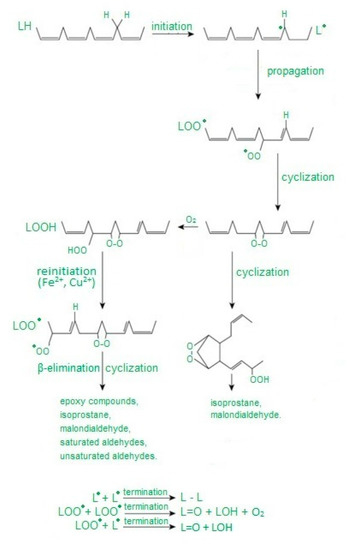 Abbreviation: L—carbon-centered lipid radical, LO—lipid alkoxyl radical, LOO—lipid peroxy radical, LOOH—lipid hydroperoxide. Free radical peroxidation of lipids according to [36] as modified by the authors.
