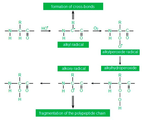 High ROS concentrations lead to oxidative modifications to proteins. Both single amino acid residues and an entire polypeptide chain may undergo oxidative modifications. Oxidation of amino acids results in their modification, breaking of the polypeptide chain and formation of cross-links within one or more polypeptide chains [34] (Figure 3). Oxidative damage to proteins leads to the loss of their biological activity and function, with all consequences for the cell.