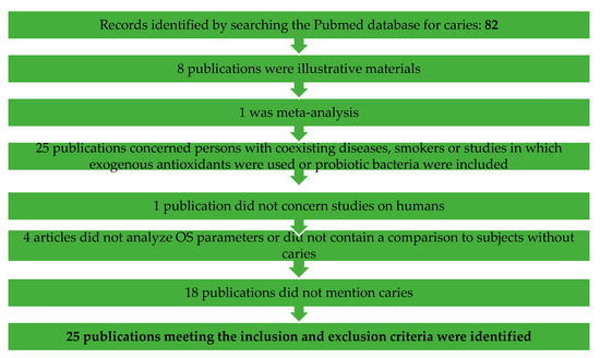 Concerning caries: 82 were found, of which 25 publications meeting the inclusion and exclusion criteria were identified. Fifty-seven publications were excluded, of which 8 publications were illustrative materials, 1 was meta-analysis, 25 publications concerned persons with coexisting diseases, smokers or studies in which exogenous antioxidants were used or probiotic bacteria were included, 1 publication did not concern studies on humans, 4 articles did not analyze OS parameters or did not contain a comparison to subjects without caries and 18 publications did not mention caries.